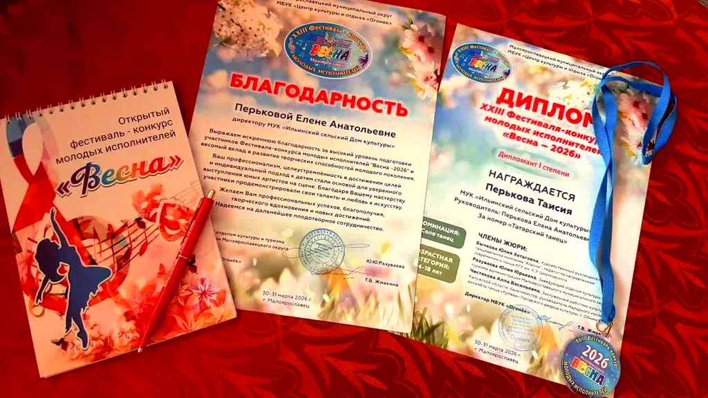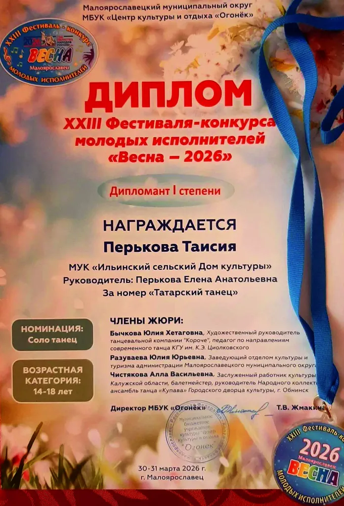 31 мая 2026 года солистка творческого коллектива "ДрайВ" Ильинского дома культуры - Таисия Перькова стала Дипломантом 1 степени в 23 фестивале-конкурсе молодых исполнителей "ВЕСНА" г. Малоярославец.